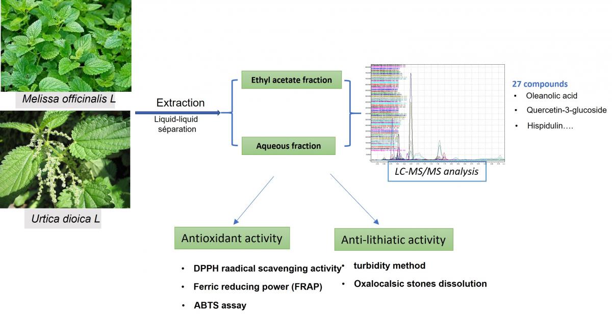 Graphycal Abstract:Melissa officinalis L. and Urtica dioica L. were evaluated for their phytochemical composition and antioxidant and anti-lithiatic activities. LC-MS/MS analysis showed that M. officinalis contained a more diverse profile, especially flavonoids and phenolic acids enriched in the ethyl acetate fraction, while U. dioica demonstrated a simpler composition dominated by myricetin, riboflavin, sinapic acid, catechin, and β-carotene in its aqueous fraction. M. officinalis ethyl acetate extract showed the strongest antioxidant capacity in DPPH, ABTS, and FRAP assays. Its aqueous extract also exhibited notable anti-lithiatic activity, inhibiting calcium oxalate crystal formation by 87.12% at 2 mg/mL.